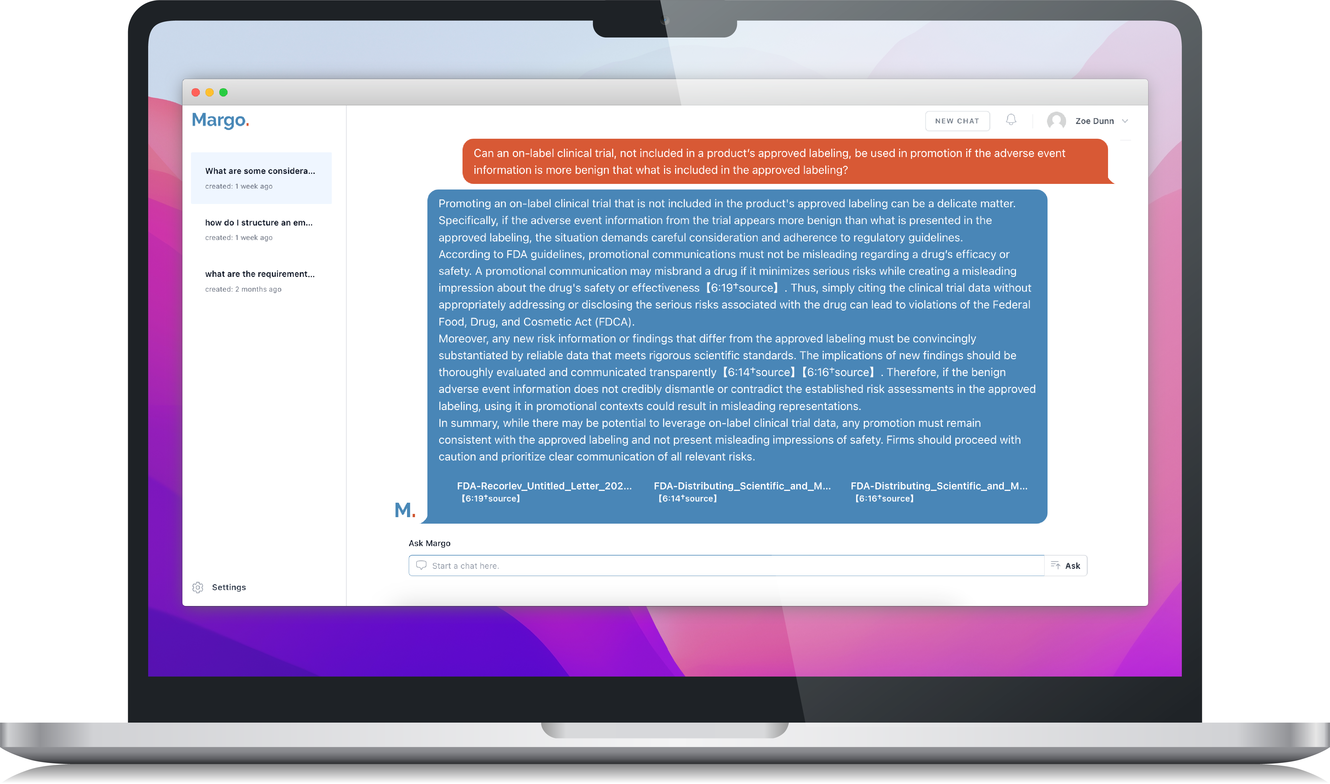 Compliant materials are uploaded to Margo’s database. These include Margo’s base package of FDA guidances plus your regulatory-approved company guidelines or other marketing governance materials. Users can ask Margo questions related to these materials and receive detailed responses, along with links to the sources for reference.